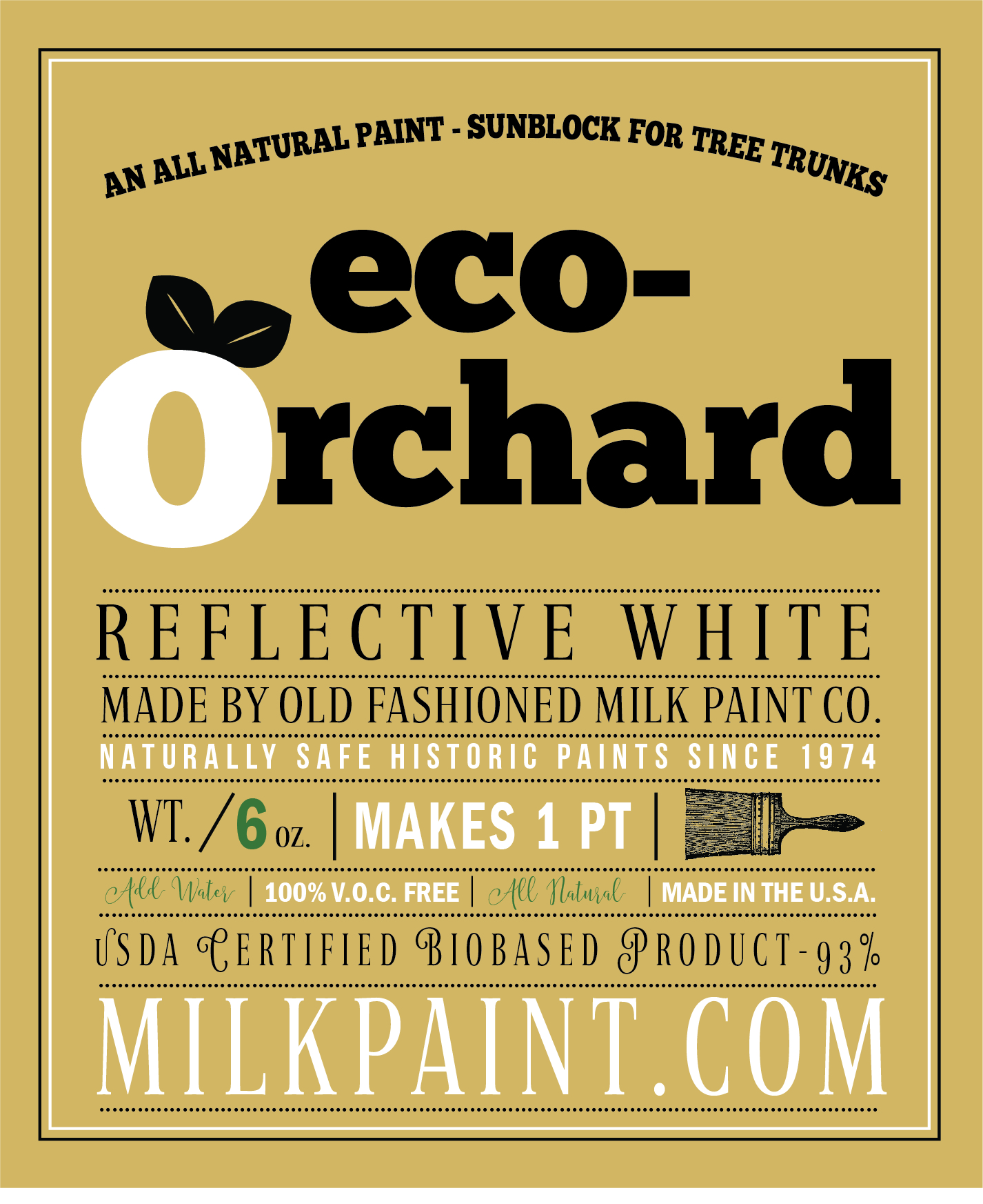 Our newest milk paint formula has been approved by certain organic farming associations for use on tree trunks to avoid sun scald. Available in powder form that mixes with water to make pints, quarts and gallons.